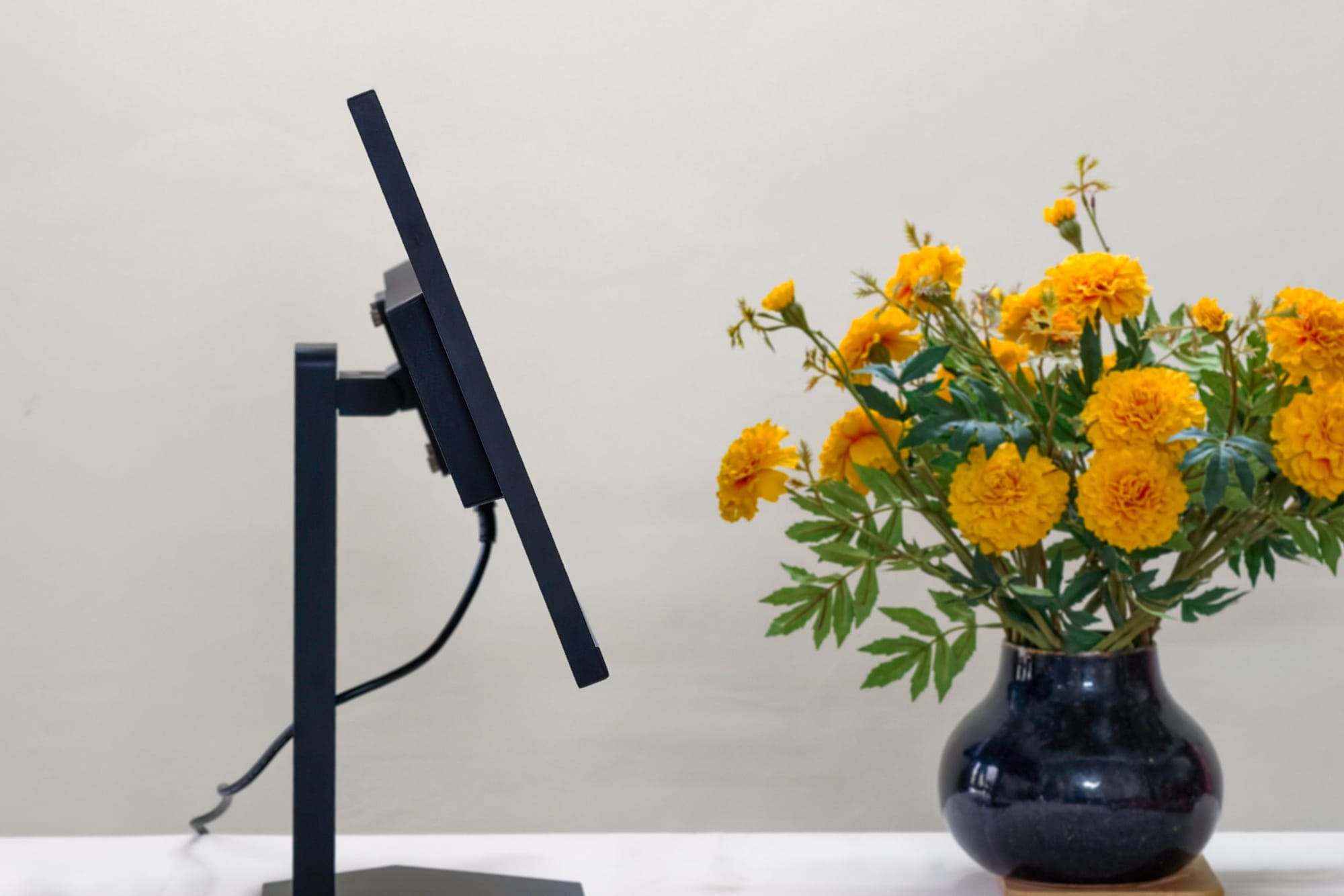 In addition to its sharp looks, the 27Q-10 is utterly simple to prop up. Four screws attach the screen to the pillar, while a single one bolts the pillar to the base. A biggish rectangular cutout through the pillar allows cords to travel easily to the back rather than actively taking up space in your vision.